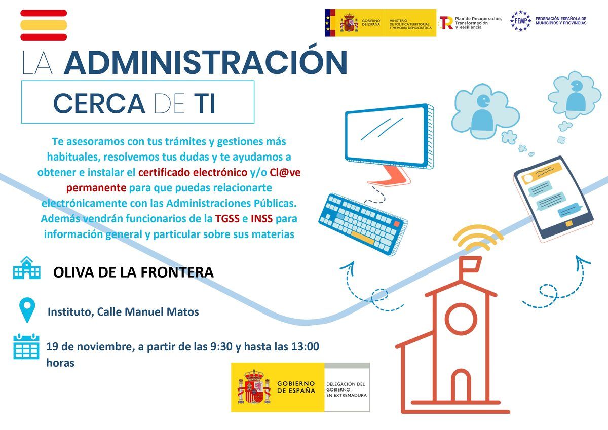 CHARLA: LA ADMINISTRACIÓN CERCA DE TI Escrito en 18 de noviembre de 2025. Publicado en Portada. Mañana 19 de noviembre nos visitarán funcionarios de la Delegación del Gobierno, TGSS e INSS, para informarnos sobre los trámites y gestiones más habituales. 💻💻💻 Anterior Siguiente
